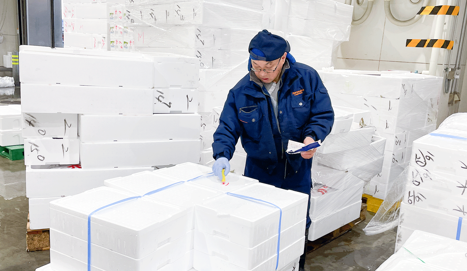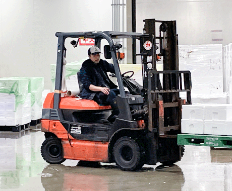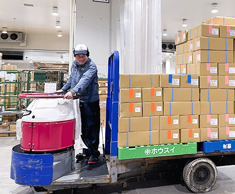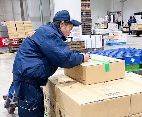 セリ人やお客様からのご依頼に応じて、販売・購入された商品の保管や当社の運搬車両を活用し仲卸店舗、配送便、冷蔵庫に納品します。また、自社トラックを活用し、市場外冷蔵庫への入出庫対応、量販店の店舗や物流センター、関東圏を中心とした他市場への配送業務も行っています。